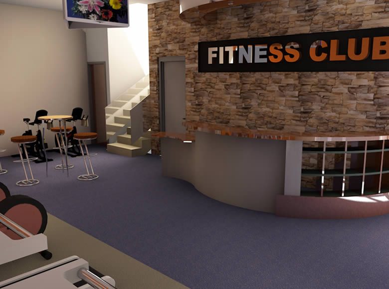 Descriptif : Etudes pour aménagement d’une salle de sport a Prima Center sur 2 niveaux avec accueil/ vitrine de vente, buvette, vestiaires, et magasin
